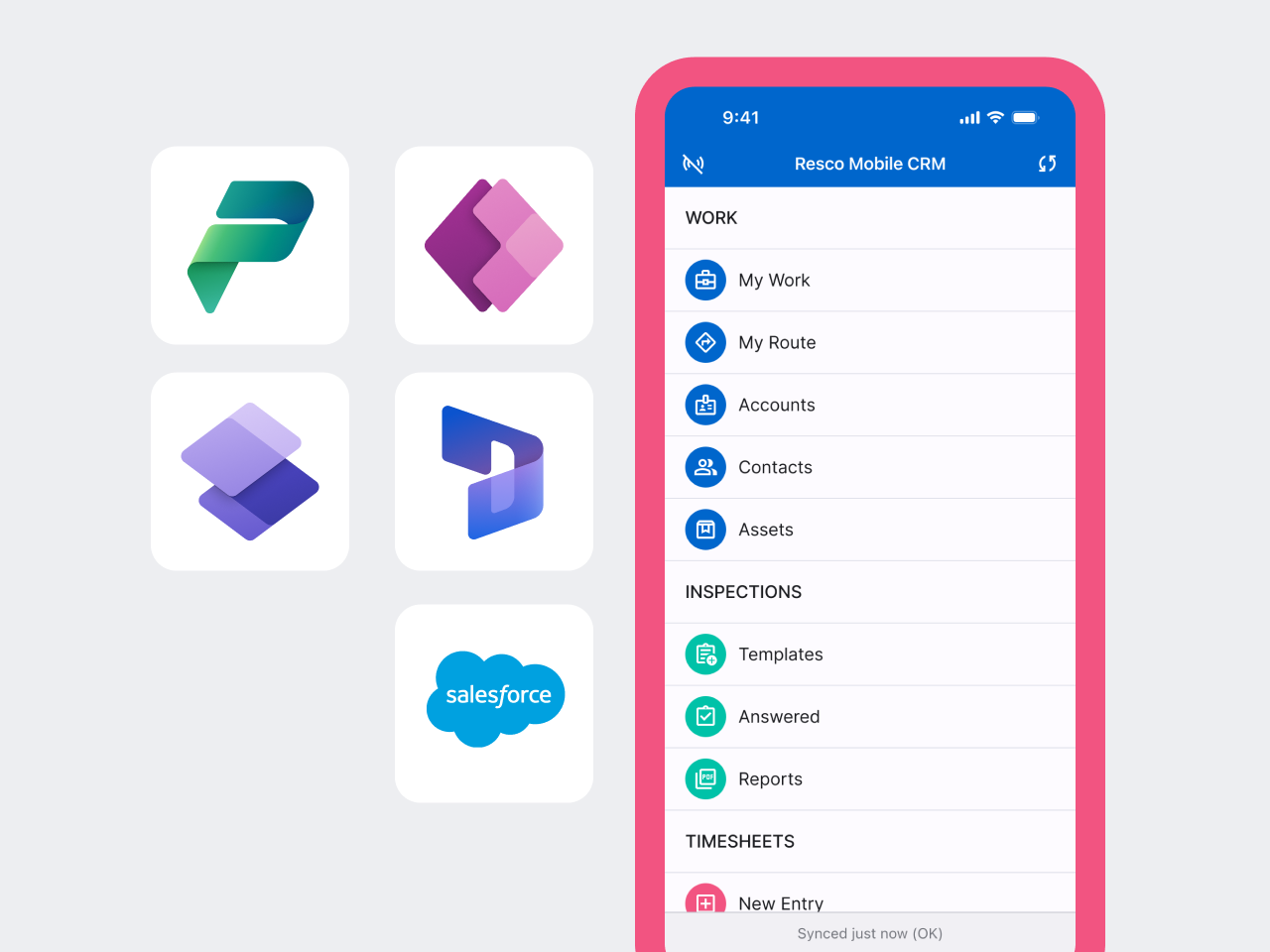 Resco connects with Microsoft Dynamics 365, Power Platform, Salesforce, and Dataverse, alongside key tools for storage, automation, docs, routing, and payment processing.
